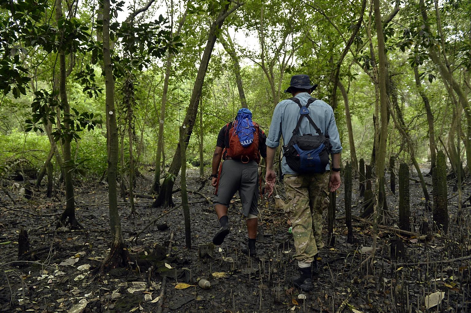 A 2013 file photo of biology lecturer N. Sivasothi (left) and mangrove expert Dan Friess, both from the National University of Singapore, at a mangrove area in Mandai.