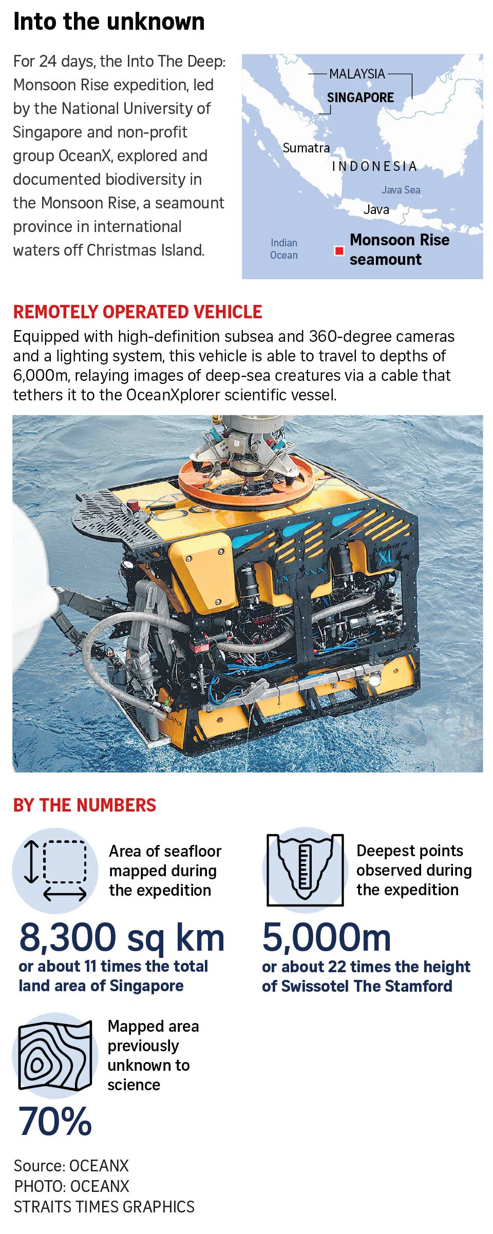 An initiative of the National University of Singapore (NUS) and OceanX, a US-based non-profit group that operates the OceanXplorer scientific vessel, the expedition explored Monsoon Rise, the seamount province in the international waters off Christmas Island.