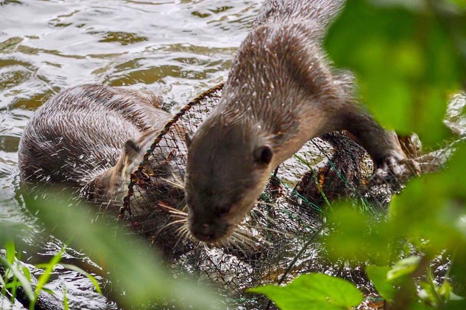 Otters were seen exploring a fish trapping cage illegally deployed at Marina Reservoir on Jan 2, 2018.