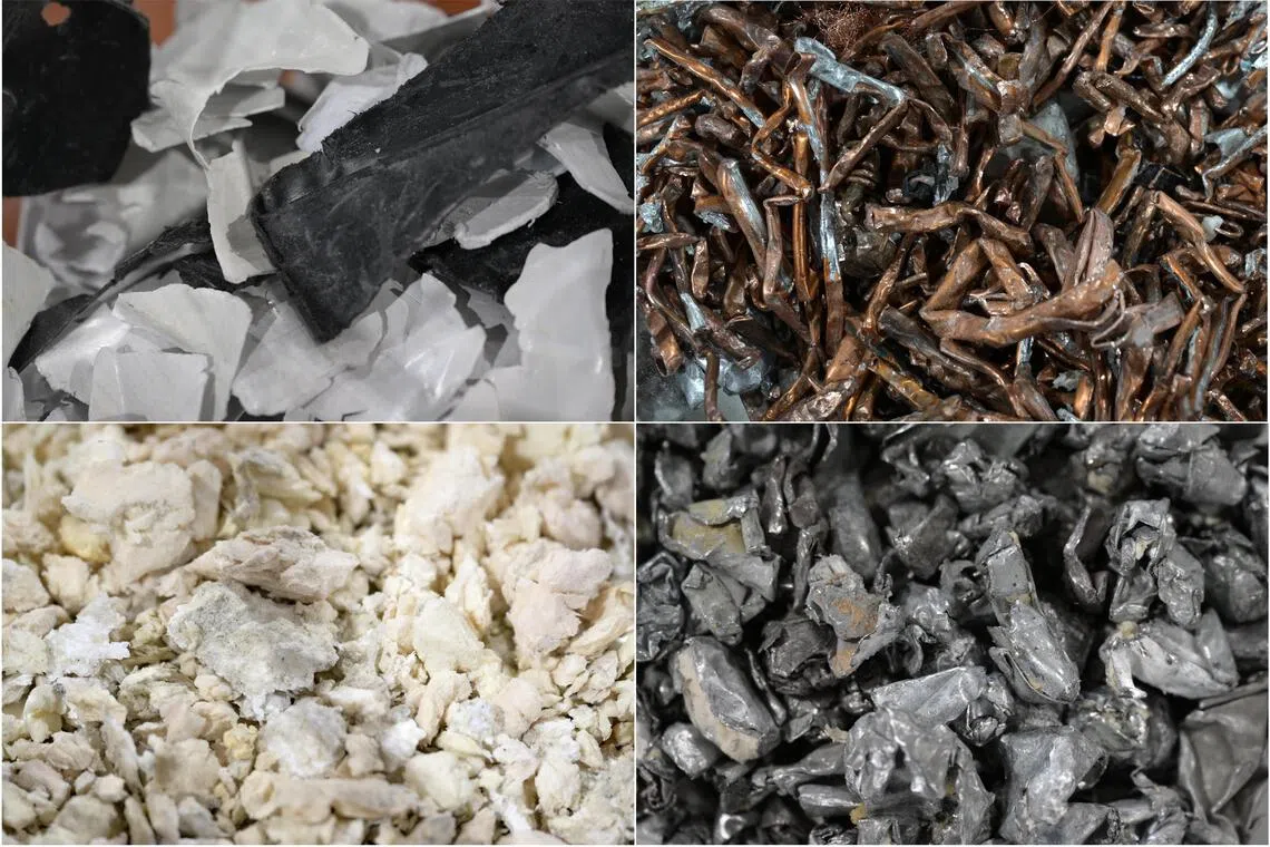 (Clockwise from top left) Plastic, non-ferrous metal, ferrous metal and foam recovered by crushing refrigerators at Cimelia Resource Recovery’s facility in Tuas.