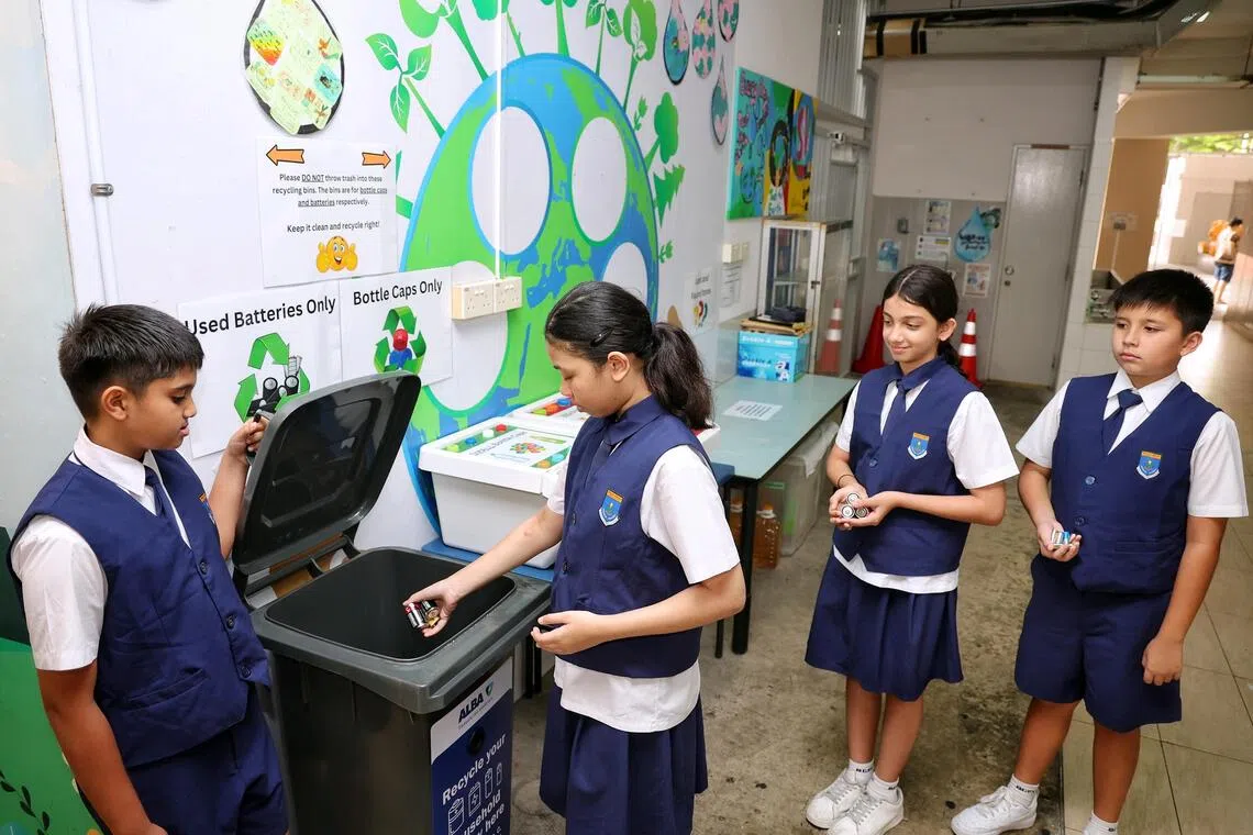 Green ambassadors and Primary 5 students (from left) Iyer Aurob, Basyeerah Muhammad Muzzammil, Aanya Uppal and Oscar Booth, dropping used batteries into a collection bin in the canteen of Bedok Green Primary School on Oct 8.