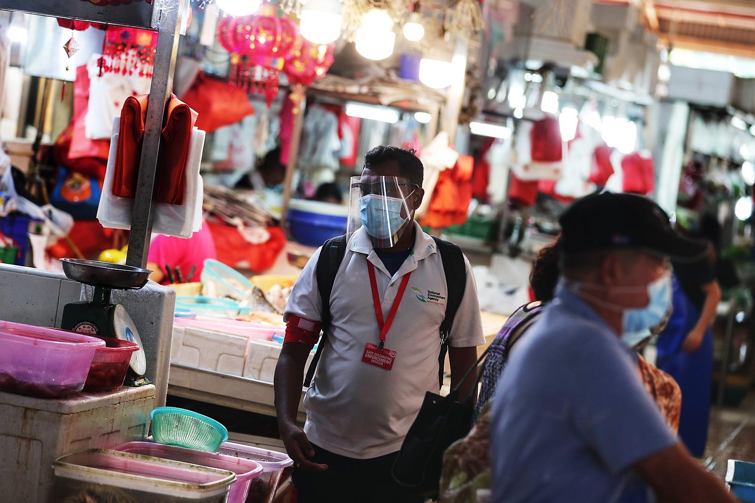 A safe distancing enforcement officer at Ghim Moh Road Market and Food Centre in May 2020.