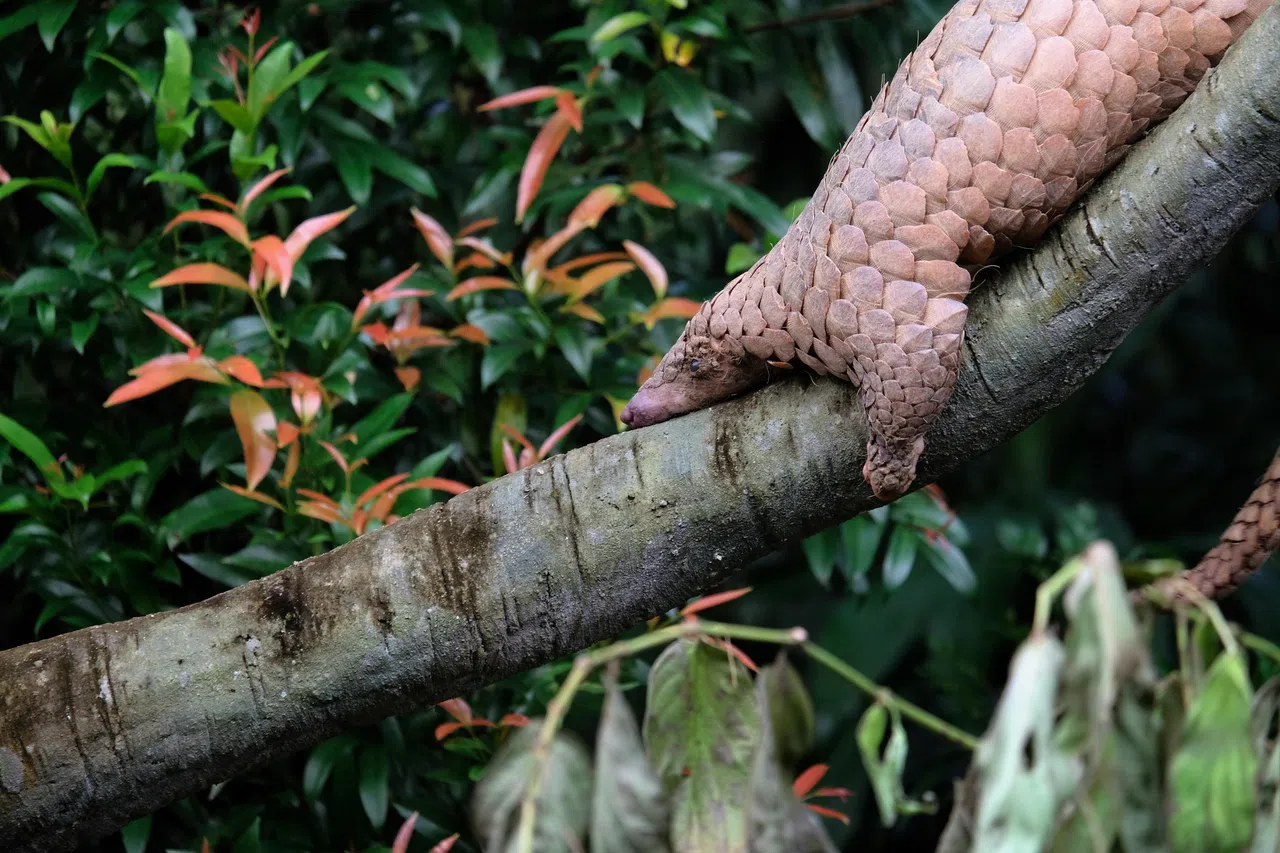 A Sunda pangolin resting on a tree in Night Safari in 2021. The creature can sleep for up to 22 hours each day.