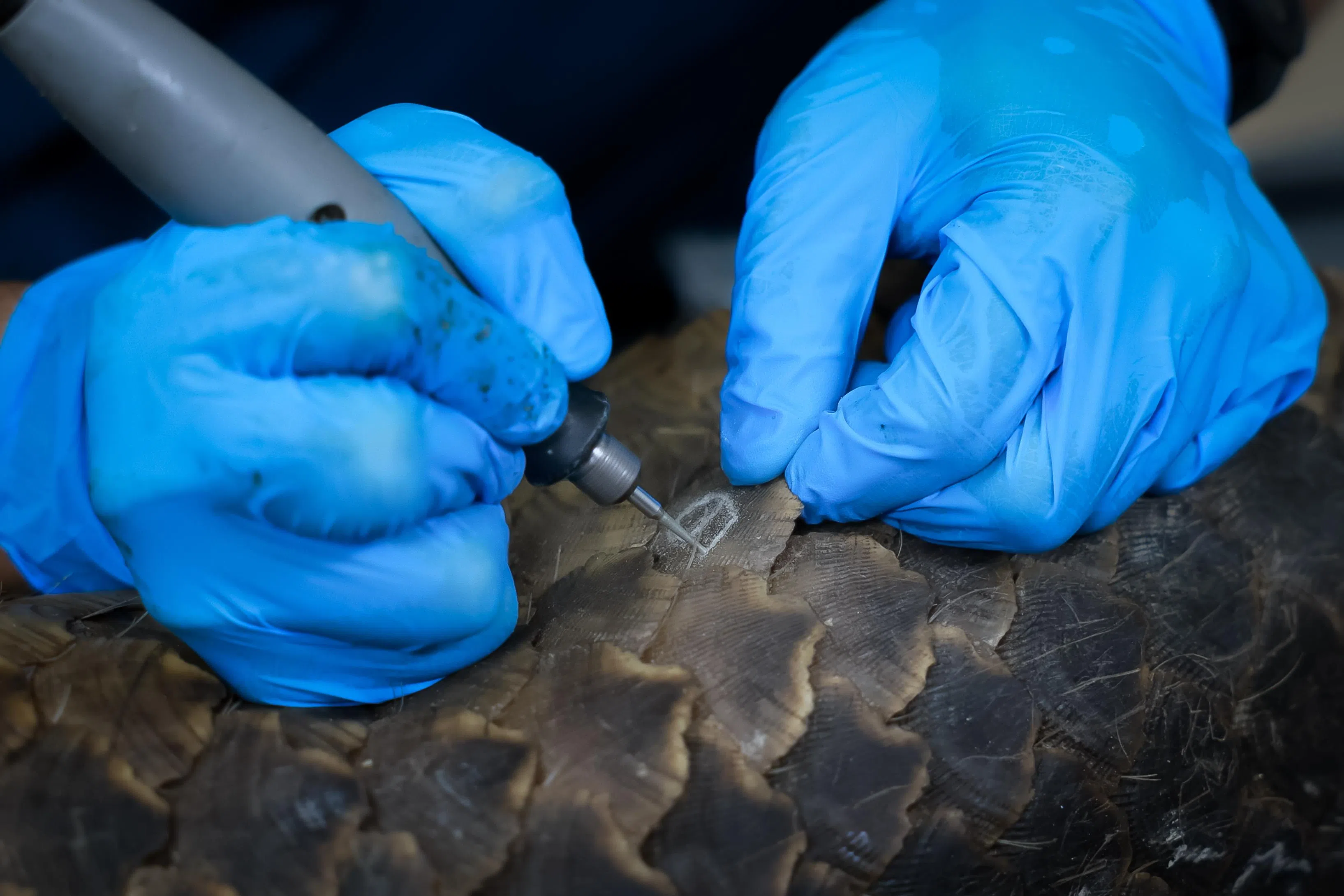 Pangolins do not shed their scales, which are made of keratin (the material that makes up hair and fingernails). This allows vets to engrave a unique identifier without hurting the creatures.