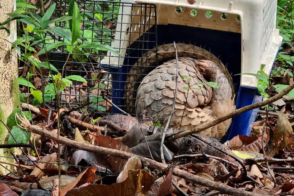 The pangolin found by a resident was released in the Central Catchment Nature Reserve on Feb 14, a day after a health check-up at the Wildlife Healthcare and Research Centre. Pangolins curl up into a ball to protect themselves with their scales when they feel threatened.