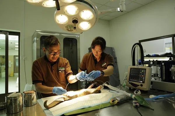 (Left) Mandai Wildlife Group assistant vice-president for veterinary healthcare Heng Yirui, veterinary nurse Maxine Ng and senior veterinary nurse Clara Yeo conduct a full heath check on a male Sunda pangolin.