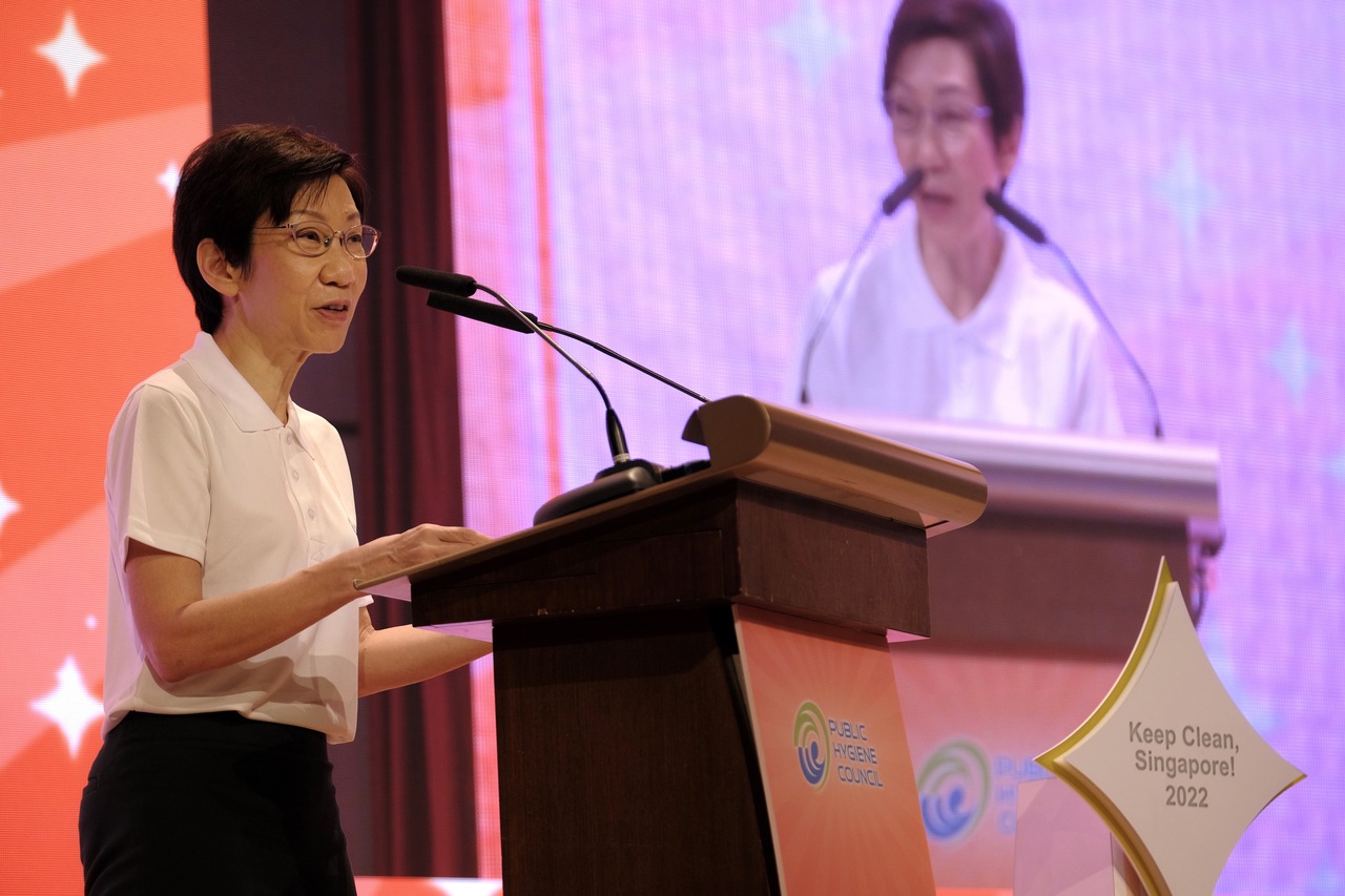 Minister for Sustainability and the Environment Grace Fu at the launch of this year's Keep Clean, Singapore campaign at NTUC Centre on April 24, 2022.