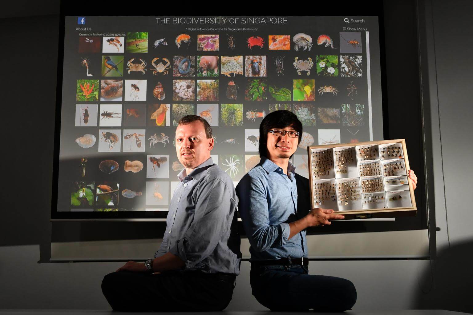 Ang Yuchen (right) Museum Officer, Lee Kong Chian Natural History Museum, holding specimens of fly species featured on the Biodiversity of Singapore, and Rudolf Meier, Deputy Head, Lee Kong Chian Natural History Museum, in front of projection of the Biodiversity of Singapore Digital Reference Collection at Lee Kong Chian Natural History Museum on March 12, 2018.