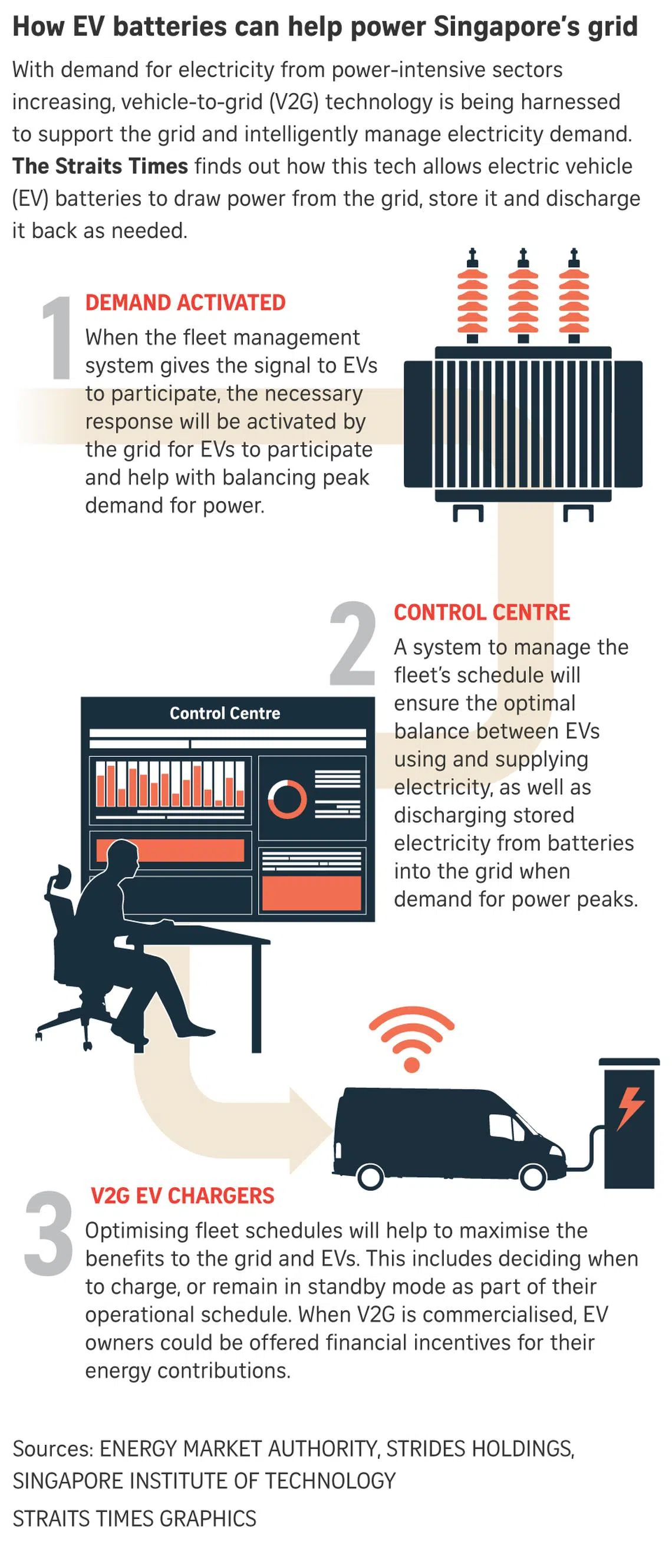 SINGAPORE – Power from batteries in electric vehicles (EVs) could potentially be used to help the country’s electricity grid meet peak demand, under a pilot programme that will start in November.