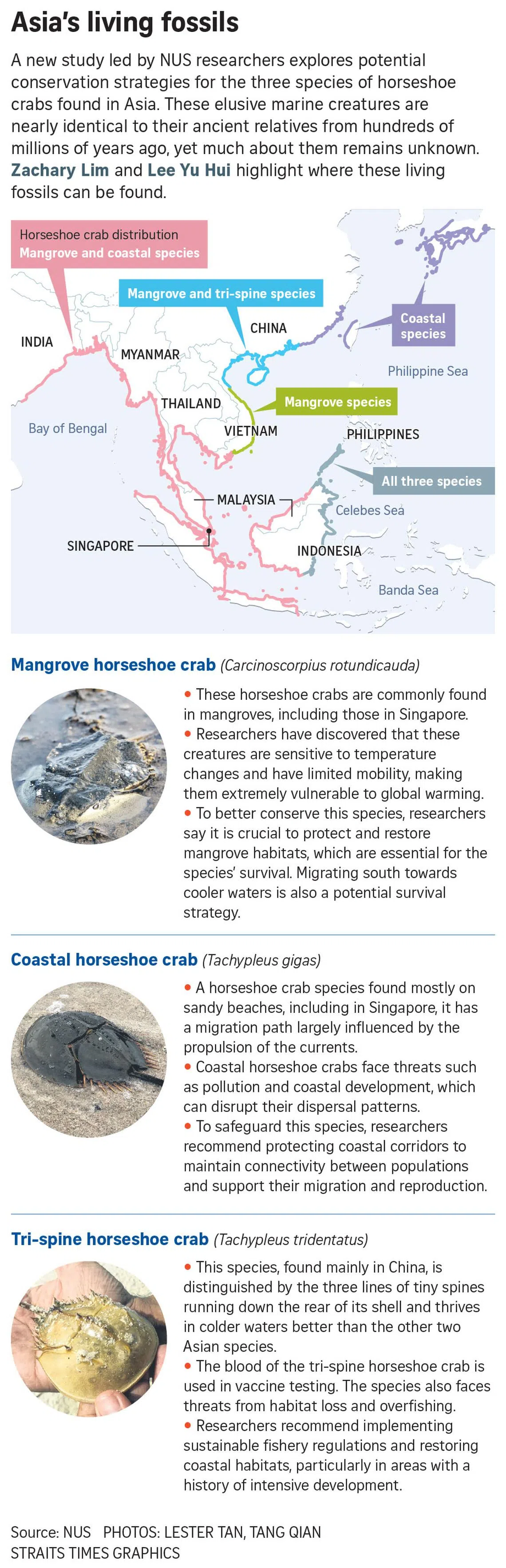The mangrove and coastal horseshoe crabs are prehistoric-looking marine animals that can be found in Singapore and other parts of South-east Asia, such as Malaysia, Indonesia and Thailand.