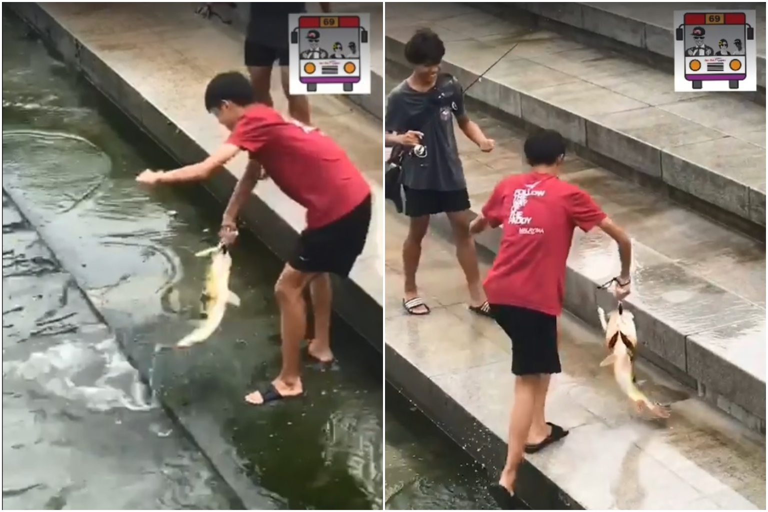 In the video, a young person in a red T-shirt can be seen on the steps, reaching into the waters surrounding the Merlion, before pulling out a large yellow fish.