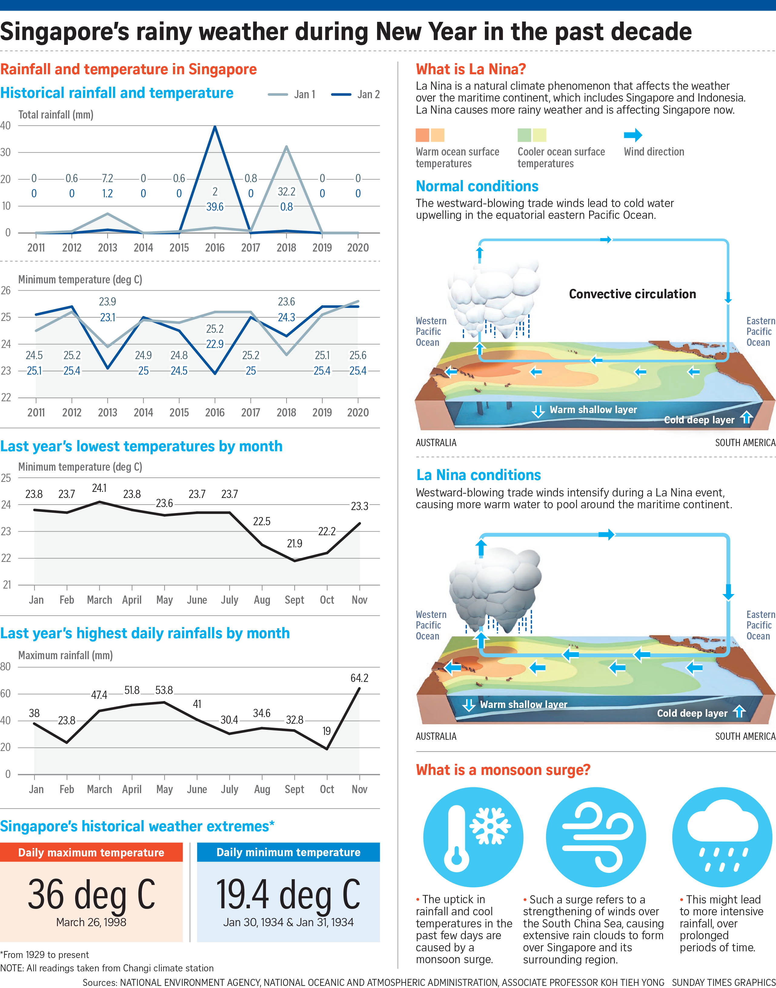 The Straits Times previously reported that La Nina conditions were detected here last November. This means wetter conditions could become more prevalent not only this month, but also next month and March.