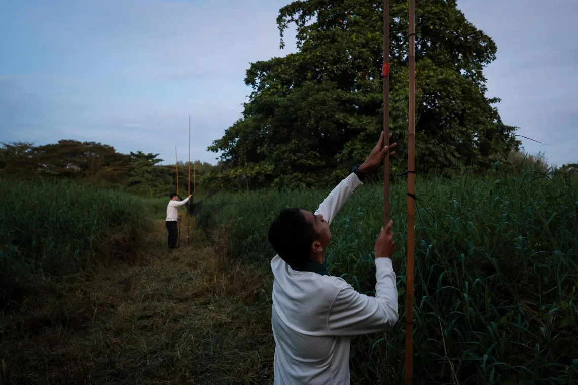 NParks officers setting up mist nets on Pulau Ubin to catch birds for biosurveillance before releasing them again.