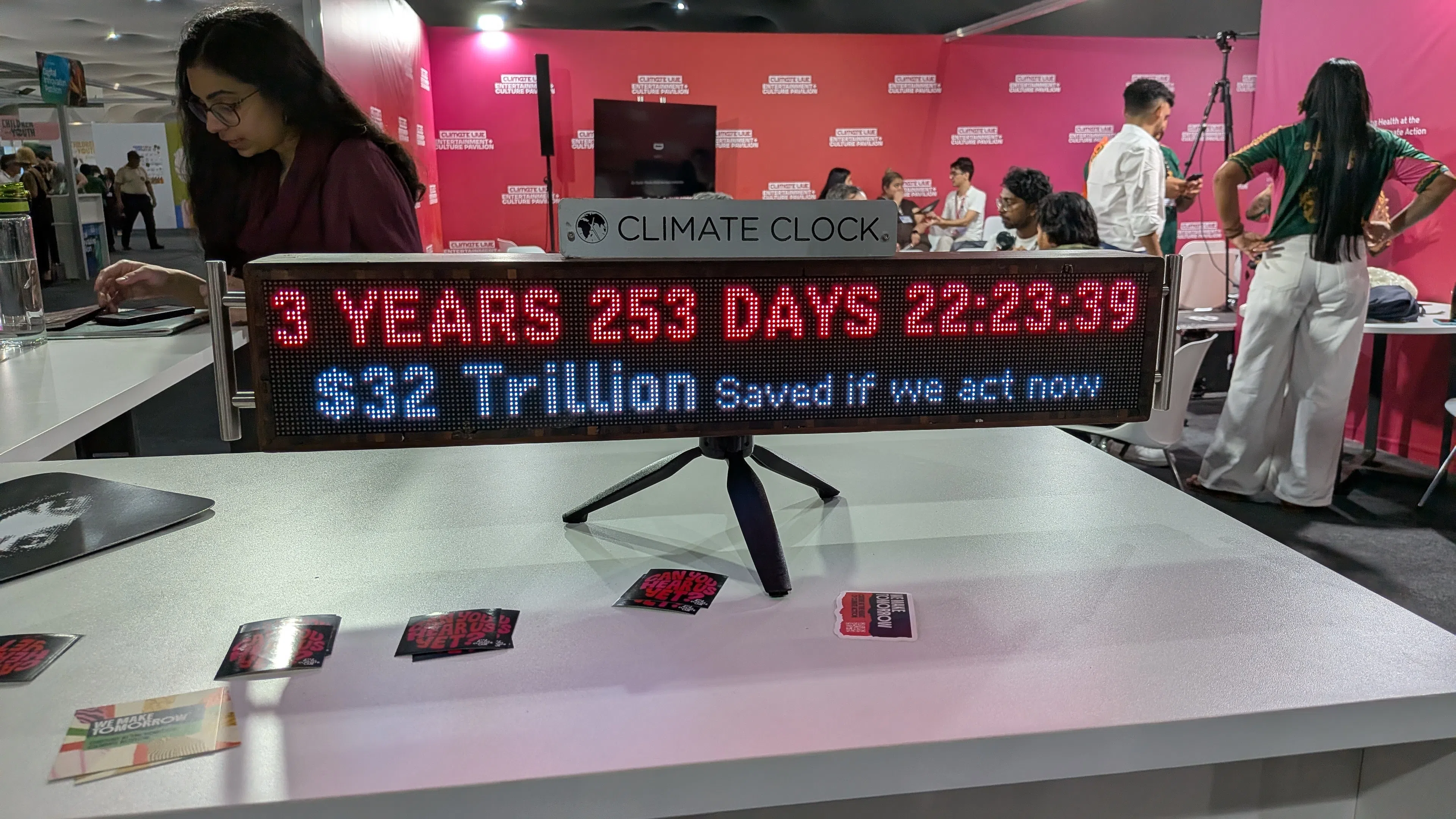 A clock at the Climate Live Entertainment + Culture pavilion that counts down to the time left to limit global warming.