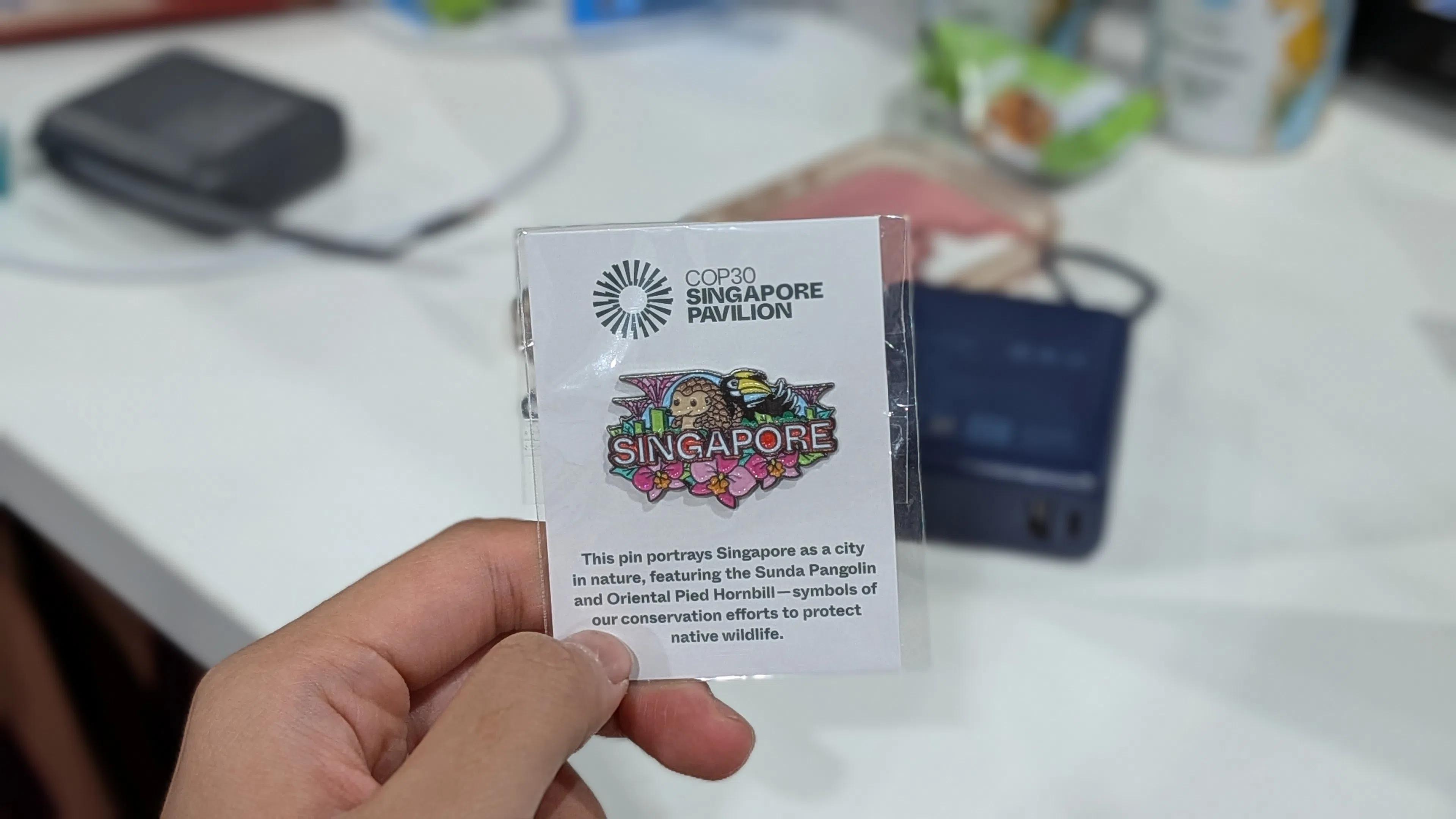 One of three pins given out by the COP30 Singapore pavilion.