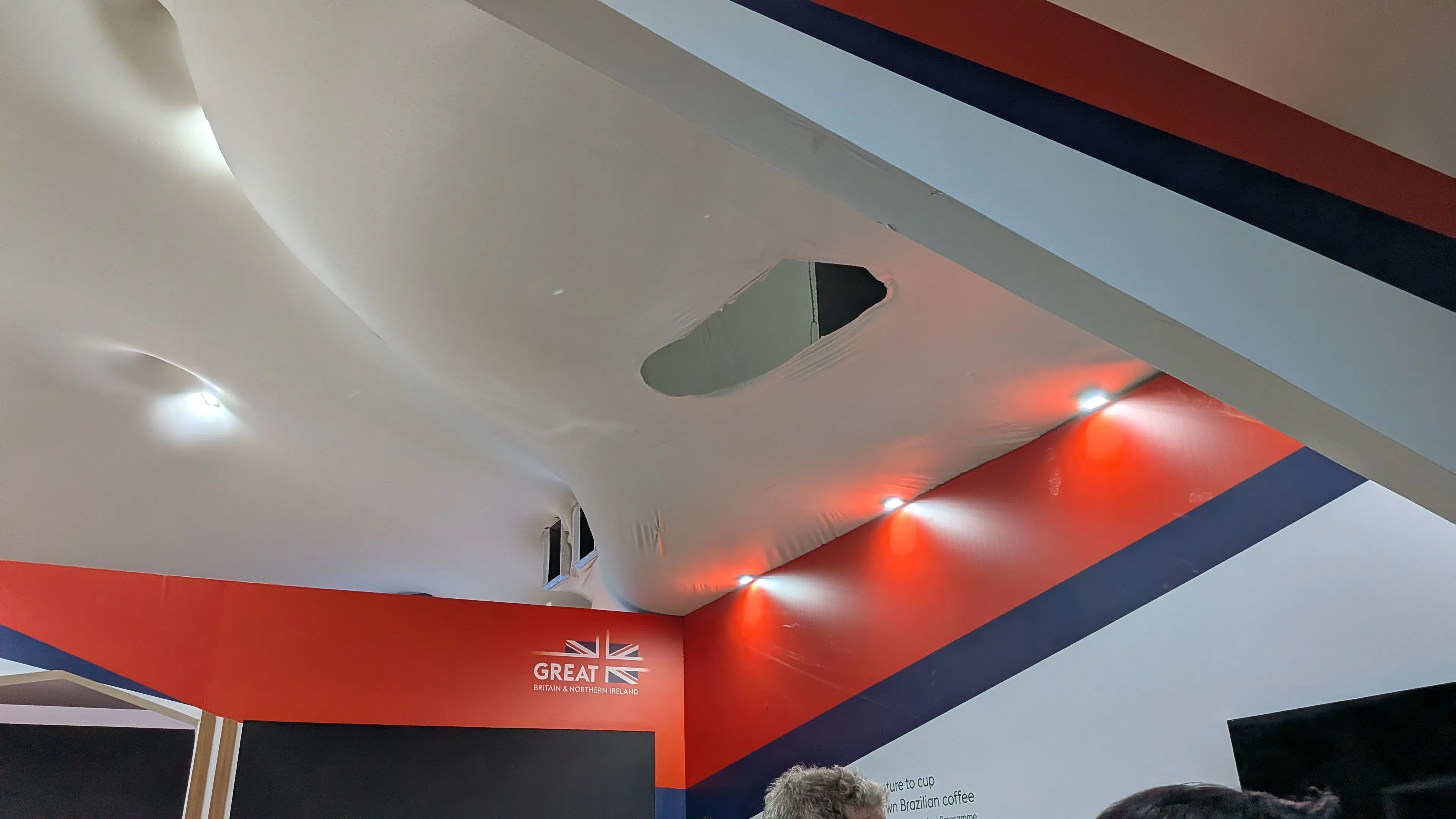 The organisers worked quickly to respond to the weather woes. By the time attendees returned to the venue on day two of the conference, the hole at the UK pavilion was patched up, and electric fans were set up near several pavilions.