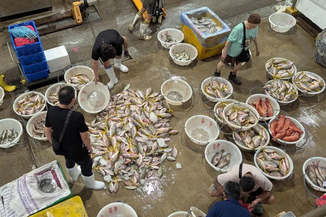 Yellowtail fish, which are traditionally overharvested, being sorted into baskets at Jurong Fishery Port on June 20.