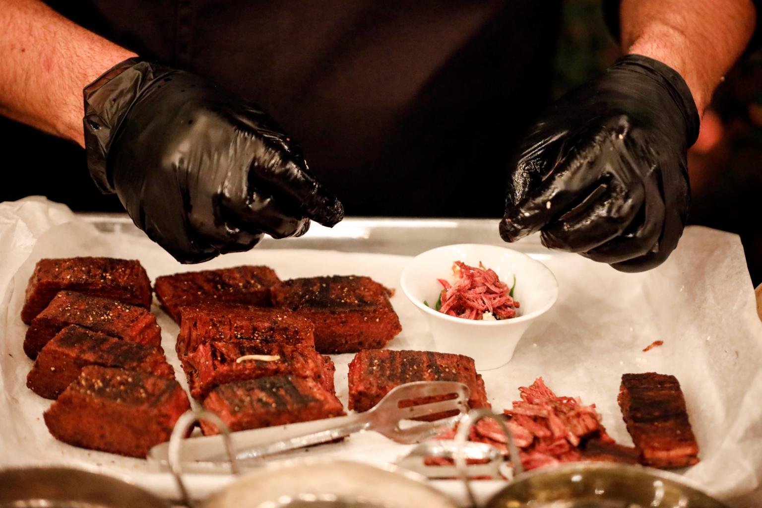 A 3D printed plant-based steak mimicking beef produced by Israeli start-up Redefine Meat at an event in Tel Aviv, Israel, last November.