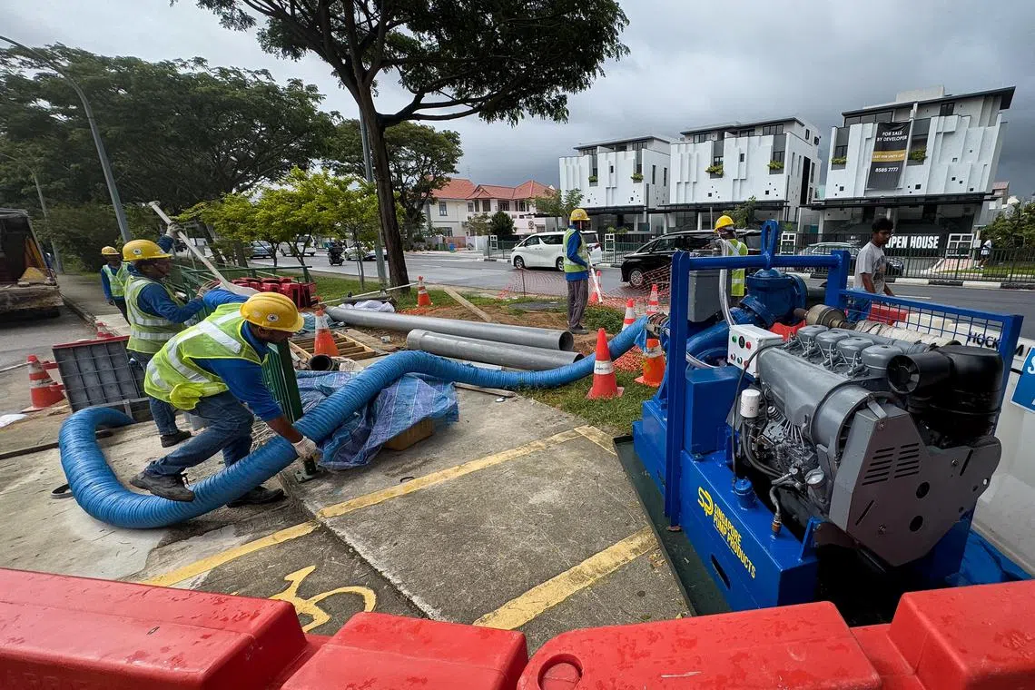 Workers installing a temporary water pump at the junction of Mountbatten Road and Jalan Seaview as a flood prevention measure on Jan 17.