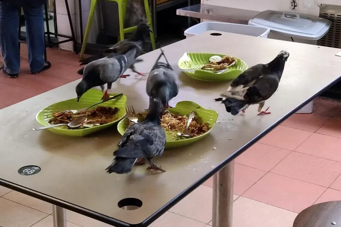 Pigeons eating from unreturned crockery left behind by customers at Changi Village Hawker Centre.