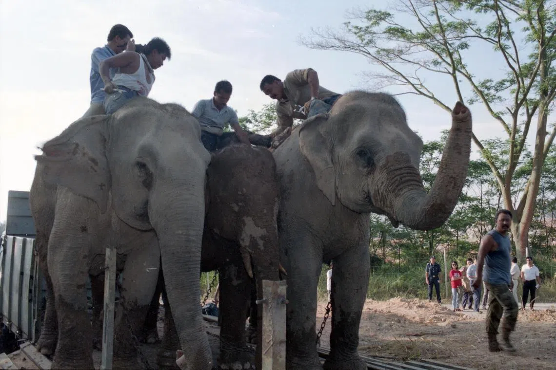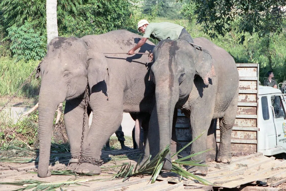 Two trained female elephants helped to lead the wild male elephant out of Pulau Ubin on March 9, 1991.