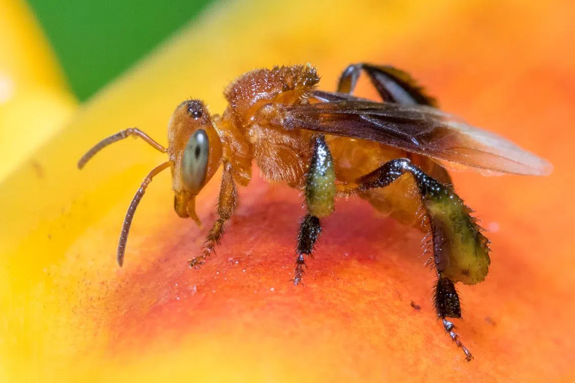 An orange-and-black stingless bee (Tetragonilla atripes) in Penang. The species is extinct in Singapore.