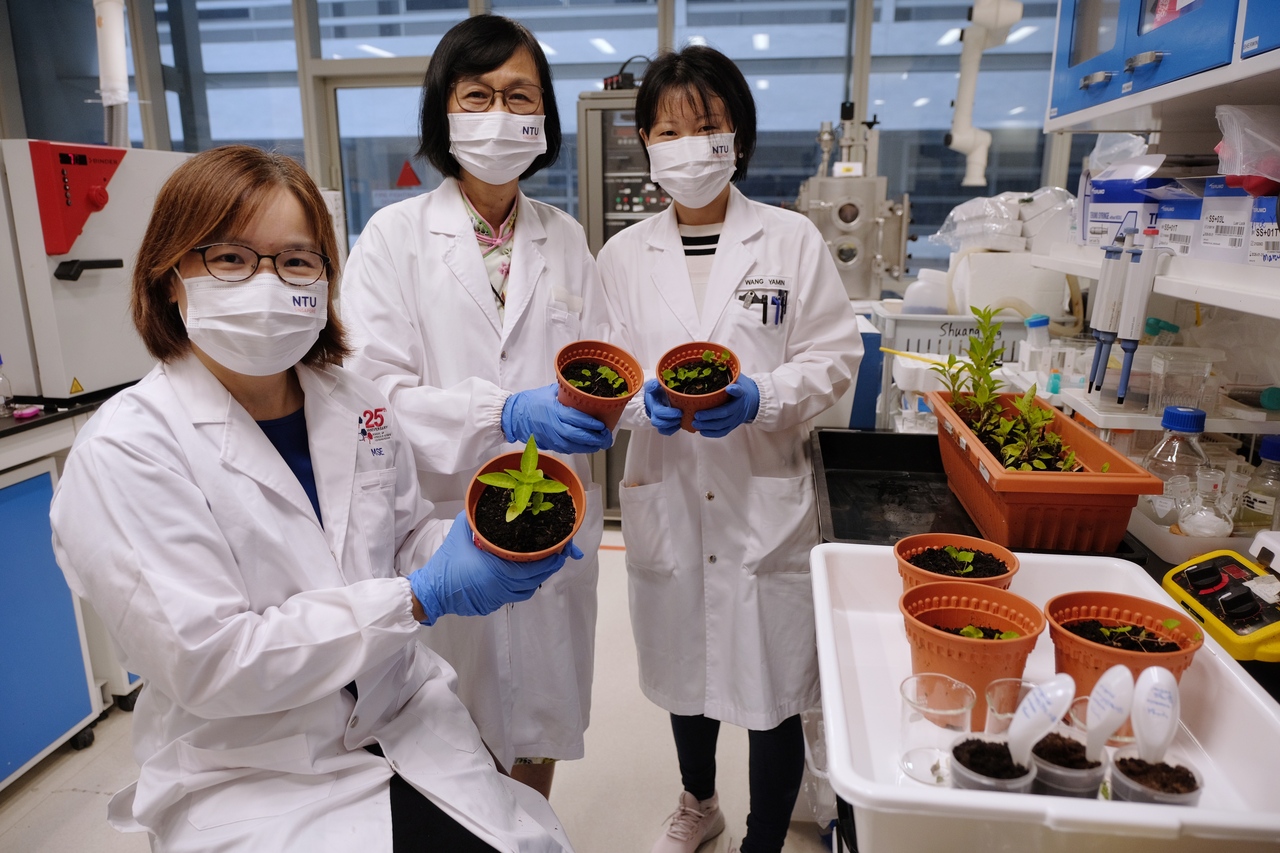 (From left) Prof Lam Yeng Ming, Assoc Prof Tan Swee Ngin and PhD student Wang Yamin with some of the plants that are able to remove toxic heavy metals from soil.
