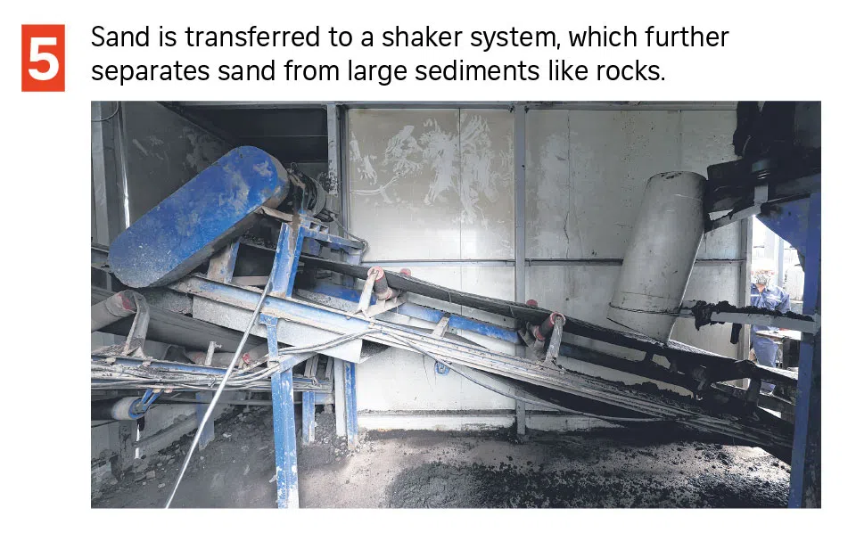 The contaminated sand is then transferred to a shaker system, which filters out coarser debris such as rocks and plastic shards from the sand to be compressed.