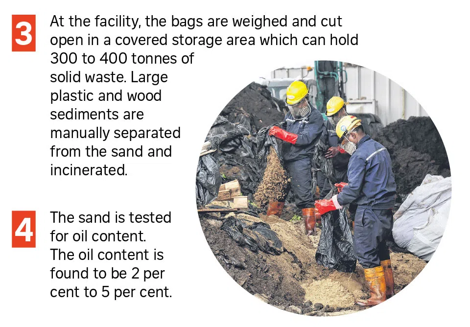 Oil-soaked sand, first bagged by NEA-appointed contractors at the various beaches, must be “unbagged” manually at the Mencast facility before the start of the treatment process.