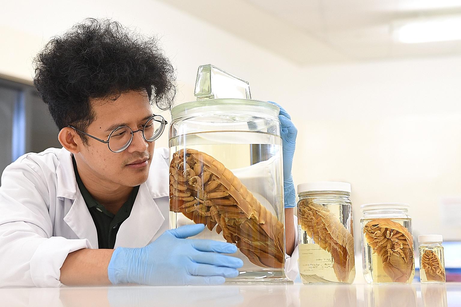 Mr Muhammad Dzaki Safaruan, a member of the 2018 deep sea biodiversity expedition in southern Java, with the Darth Vader isopod (in biggest jar) discovered during the voyage, as well as other isopods.