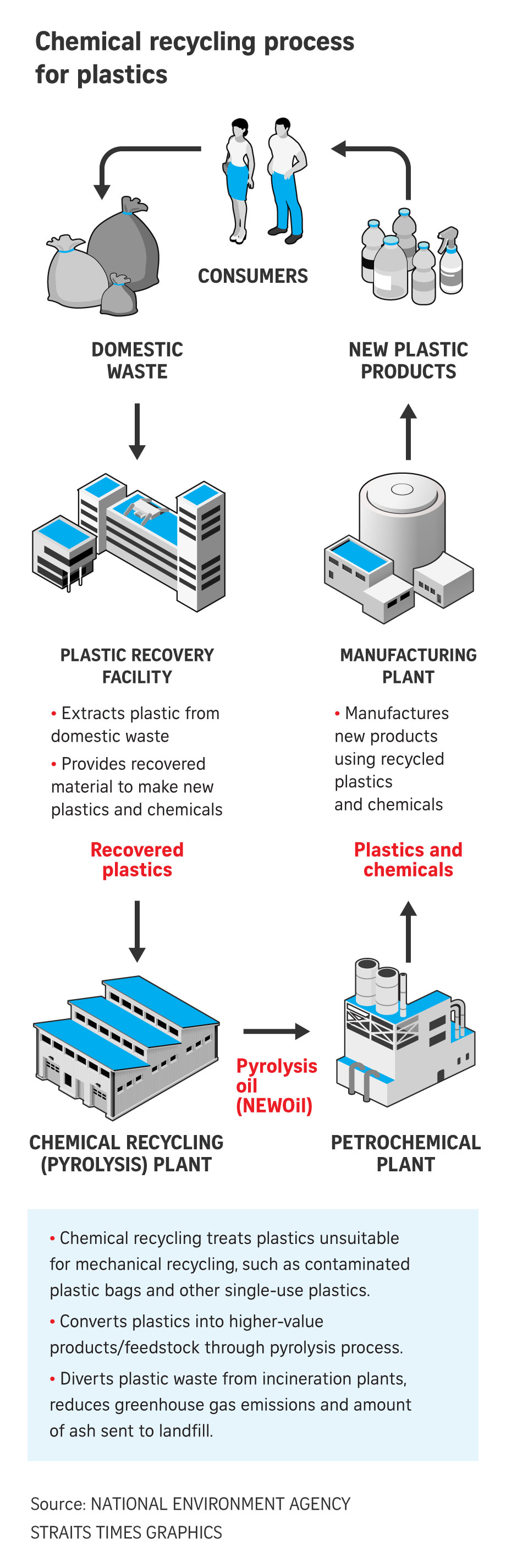 "The recovered plastics... can be converted into higher-value products such as pyrolysis oil, which can serve as feedstock for Singapore's petrochemical sector to manufacture new plastics and chemicals," said the NEA.