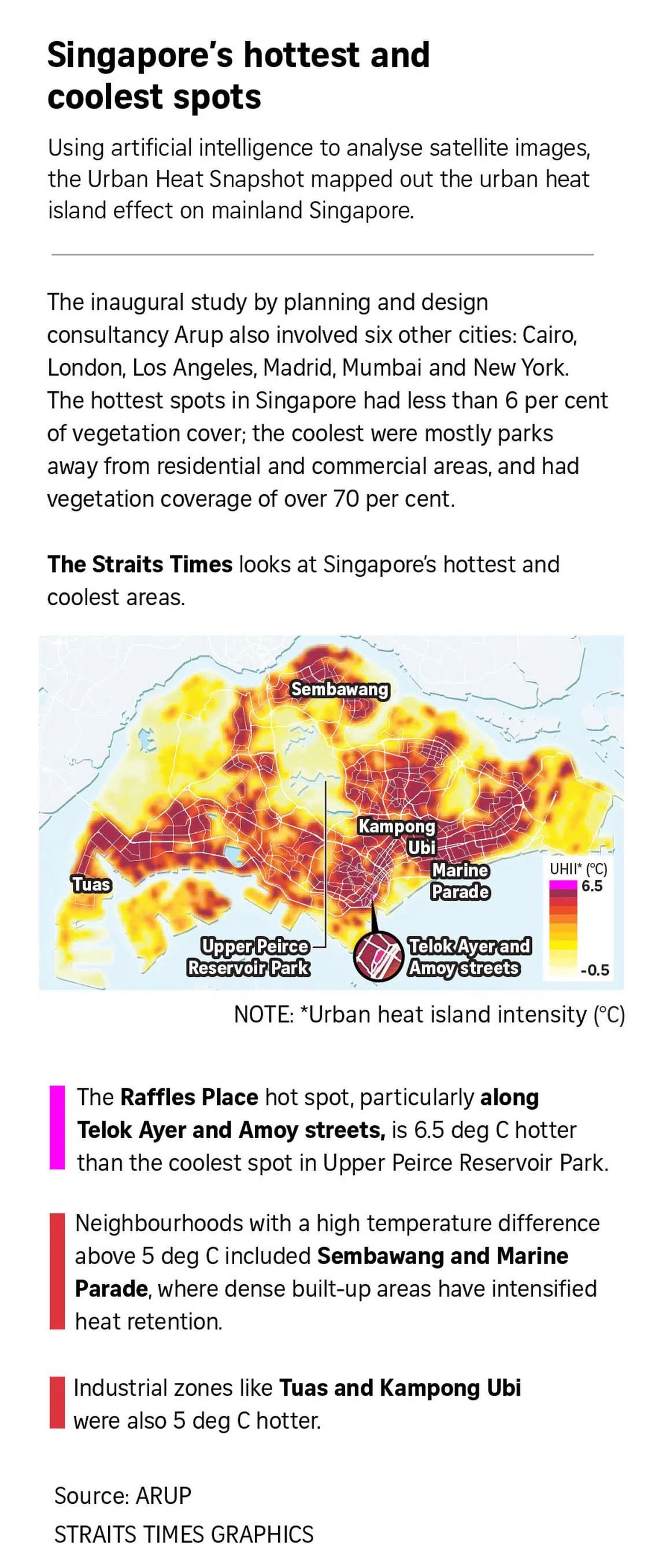 At 33.5 deg C, the Raffles Place area was 6.5 deg C hotter than the coolest spot identified, Upper Peirce Reservoir Park. The difference in temperature between the urban environment and its rural surrounding is known as the urban heat island effect.