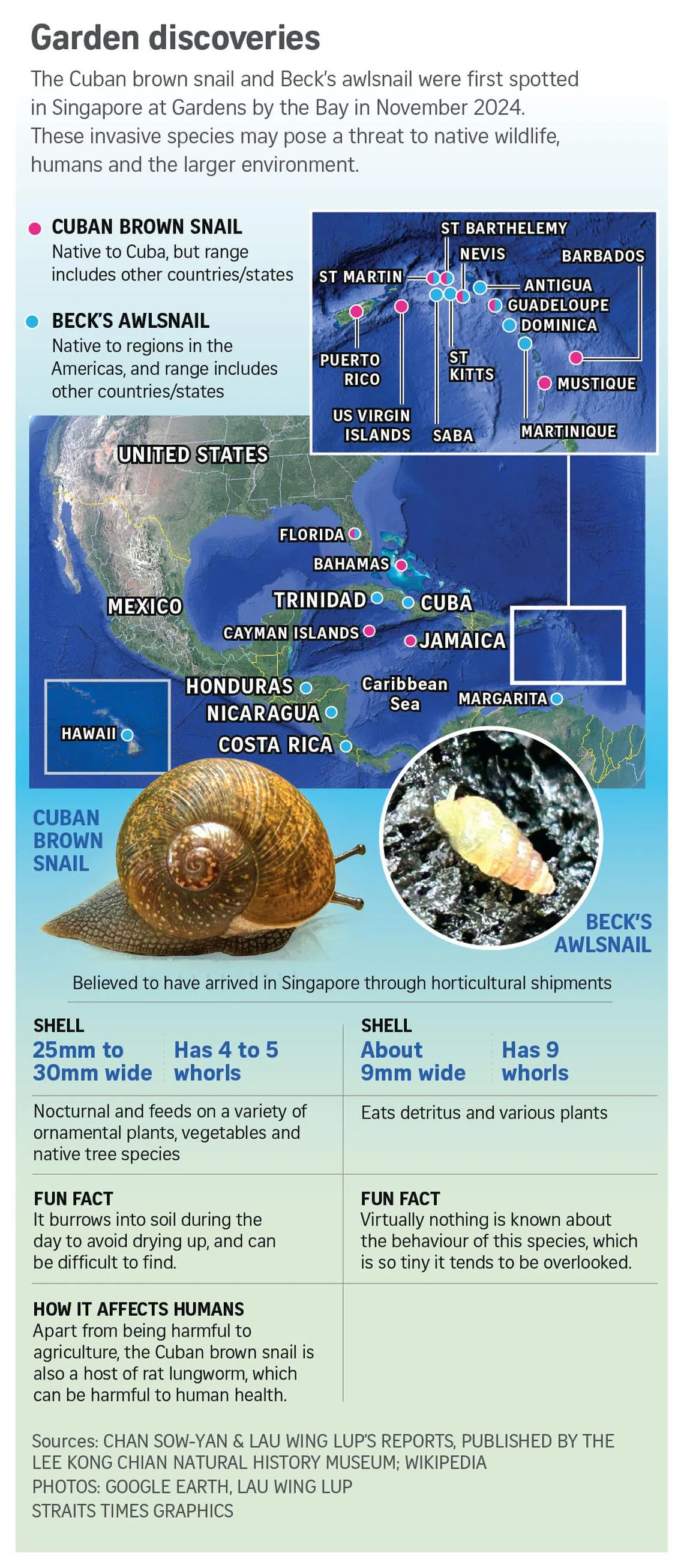 The reports on the snails, seen in November 2024 at Gardens by the Bay, were authored by Mr Chan Sow-Yan and Mr Lau Wing Lup.