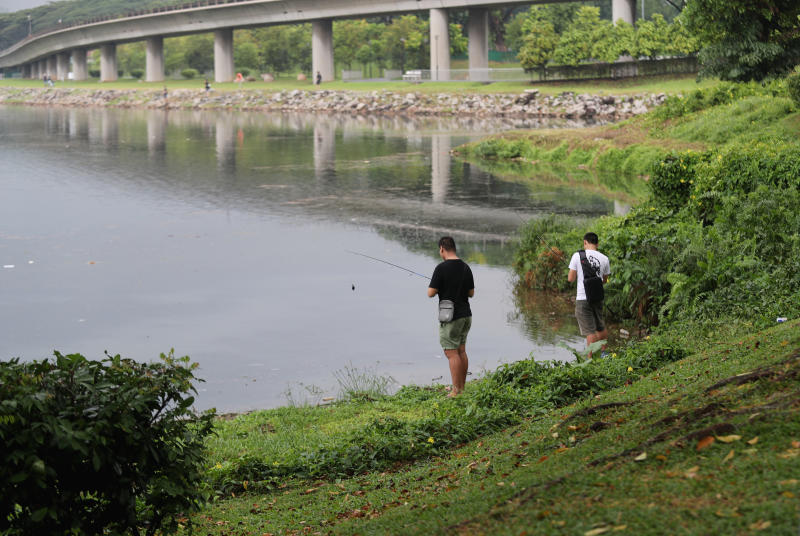 Two men fishing at Lower Seletar Reservoir, on Aug 22, 2018. PUB officers said they are hunting a crocodile that was spotted in the area on Feb 14, 2019.