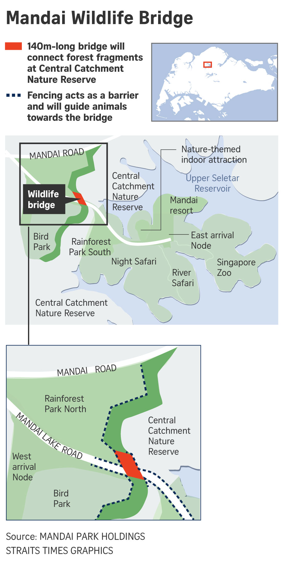 The Mandai Wildlife Bridge is not the first of its kind in Singapore. An existing National Parks Board's Eco-Link bridge spans the Bukit Timah Expressway.