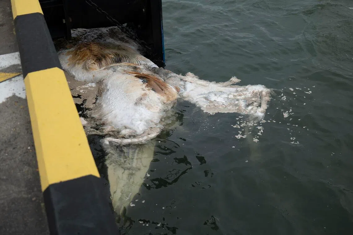 The floating whale carcass found in the waters beside Marina Bay Cruise Centre on Sept 12.