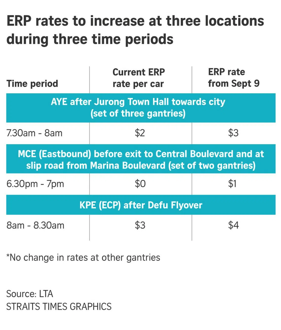 SINGAPORE - Electronic Road Pricing (ERP) rates at three locations will increase by $1 at three time periods from Sept 9, the Land Transport Authority (LTA) announced on Sept 2.