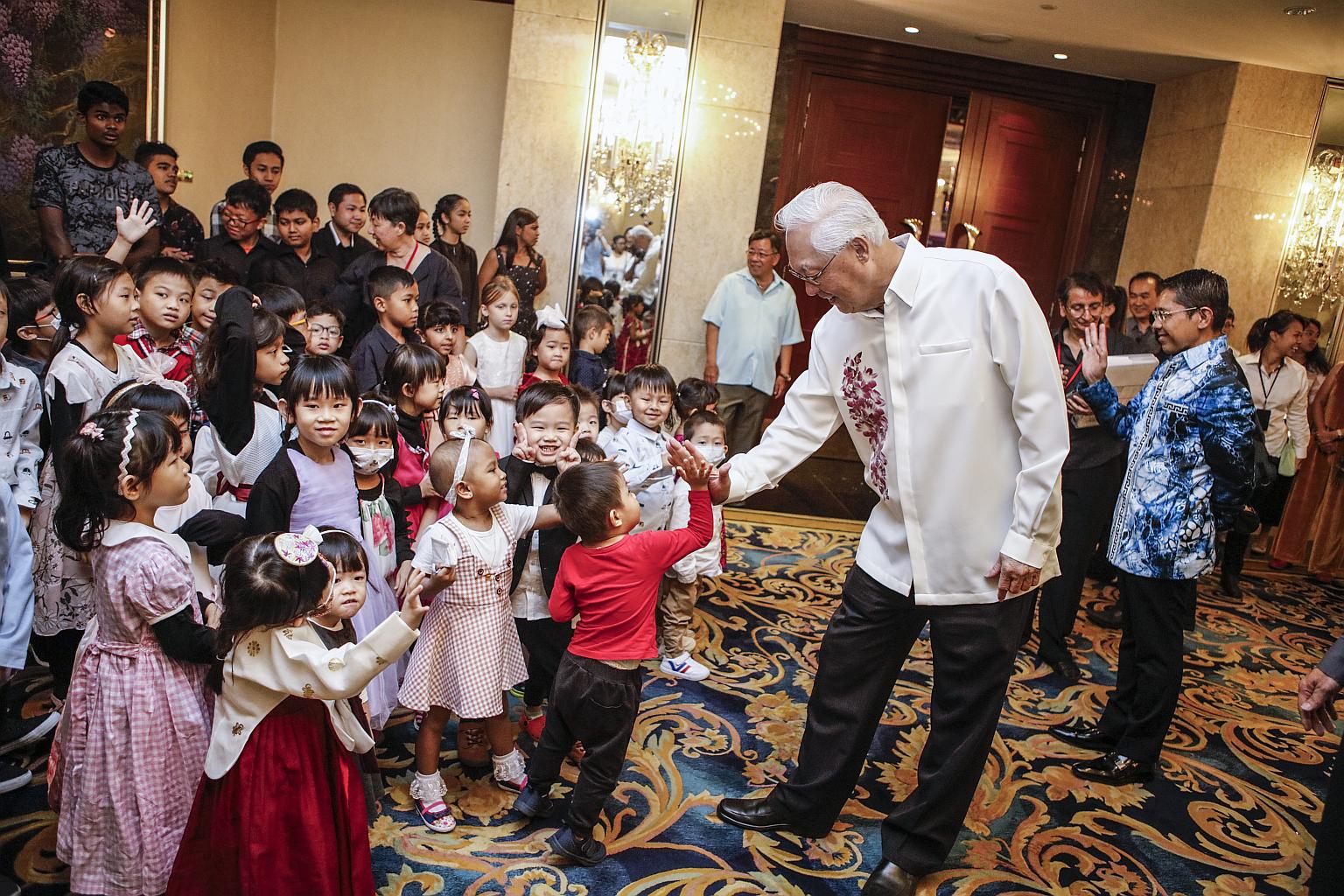 Emeritus Senior Minister Goh Chok Tong giving children high-fives at the charity gala lunch for Arc Children's Centre on June 30, 2019.