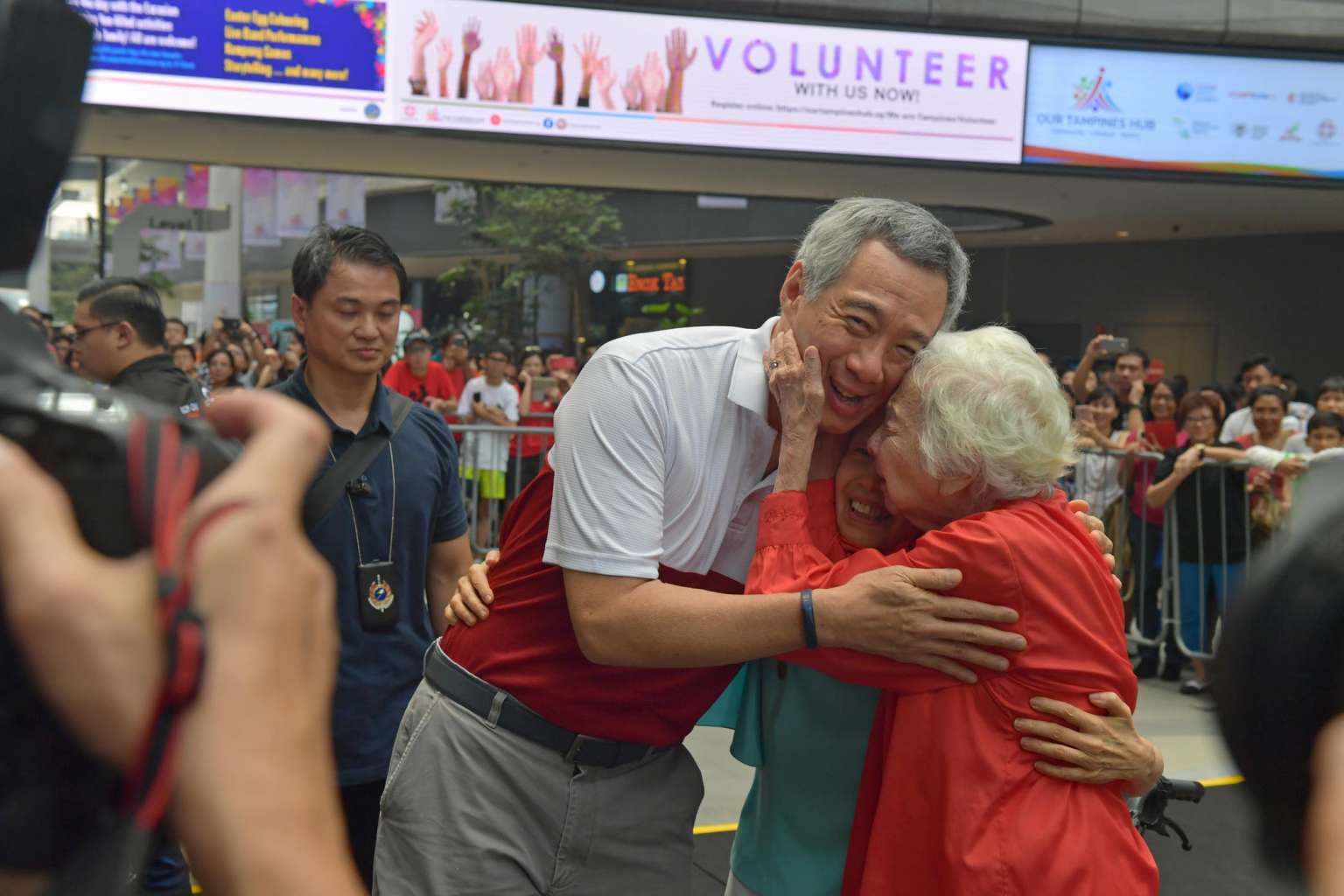 Mrs Therese Stewart (in red), 102, and her daughter, Ms Olivia Stewart, 74, hugging PM Lee Hsien Loong during the launch of the Eurasian Festival at the Tampines Hub, on April 9, 2017.