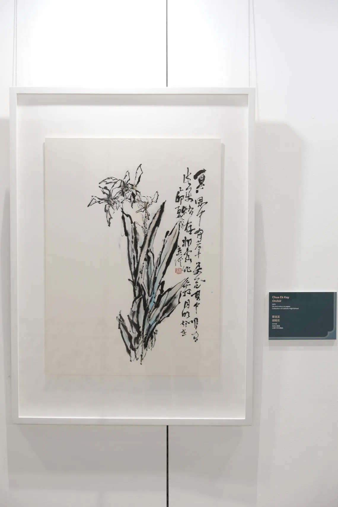 One of the works on display is Chua Ek Kay’s 1975 ink and colour painting Orchid, from Catholic High School’s collection.