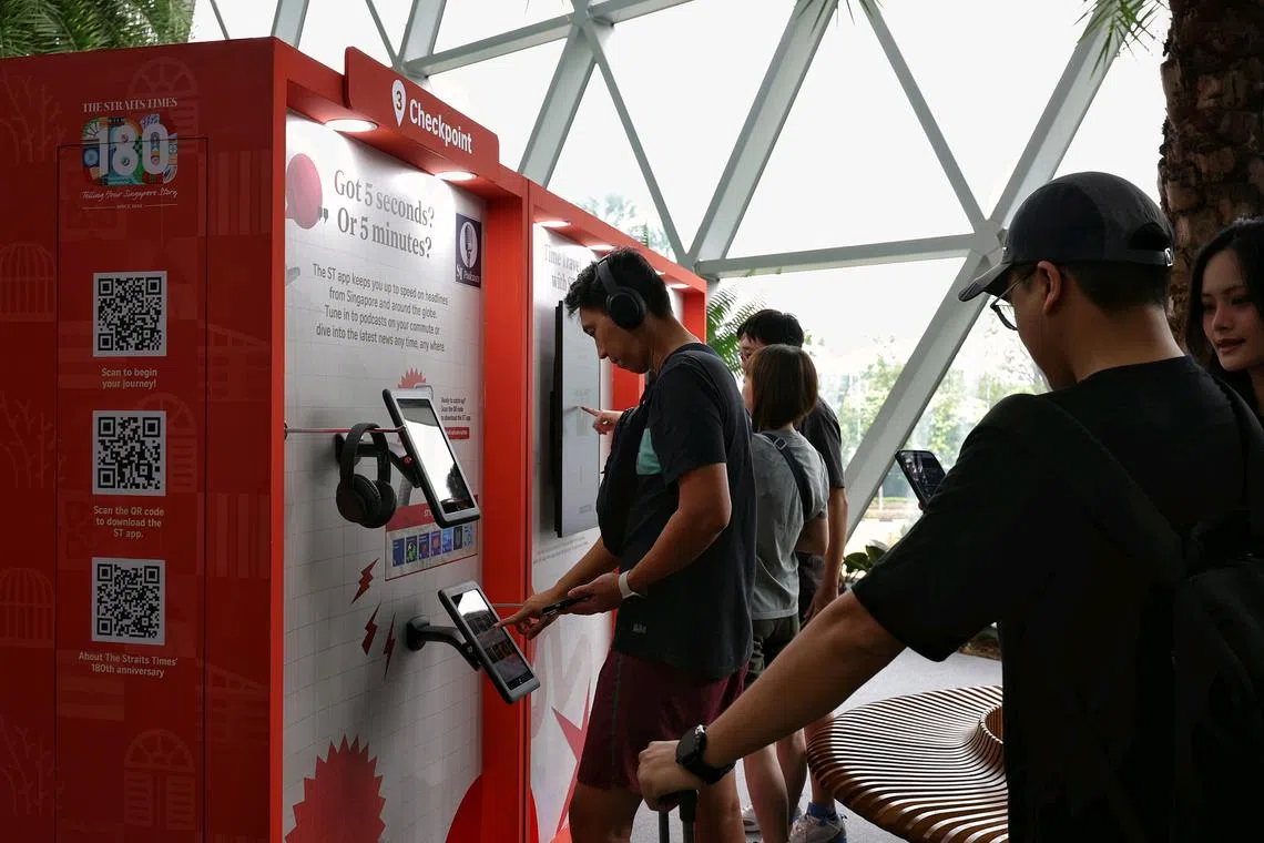 Visitors tuning in to podcasts and exploring ST’s front pages of decades past at an interactive section of the exhibition.