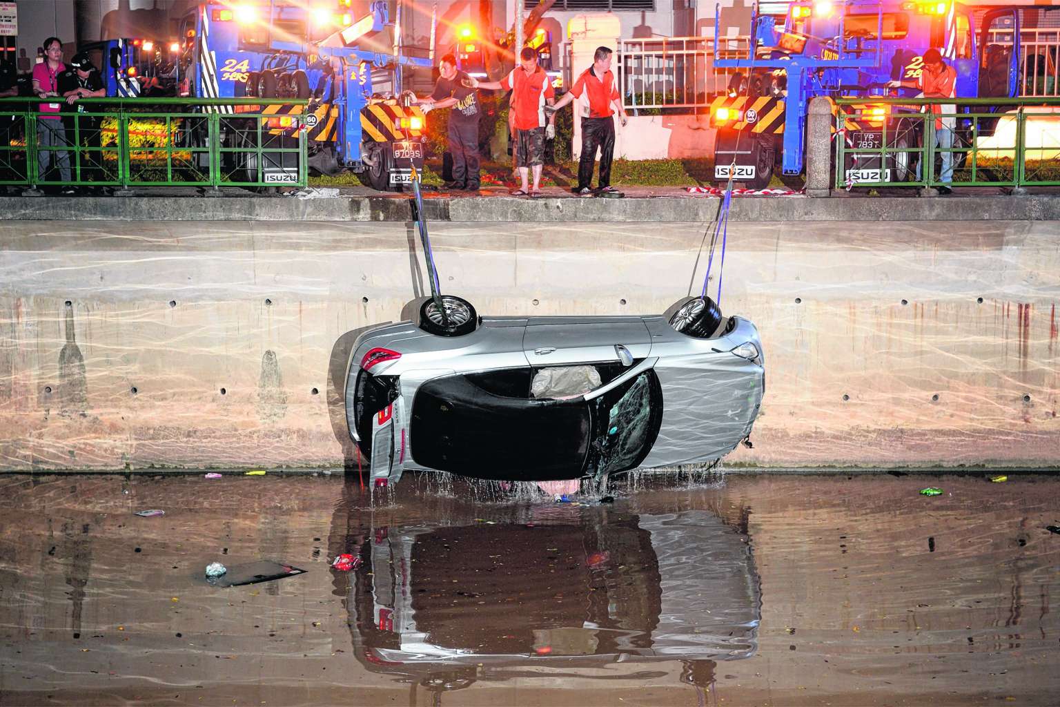 Three tow trucks hoist the car which crashed into the Alexandra Canal on Jan 25, 2016.