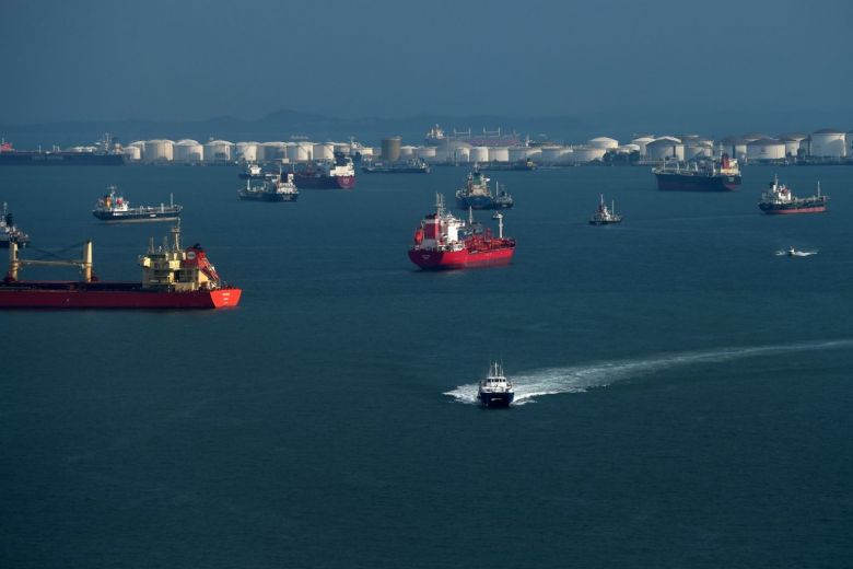 A photo taken on July 26, 2019, showing container ships moored off the Singapore Strait.