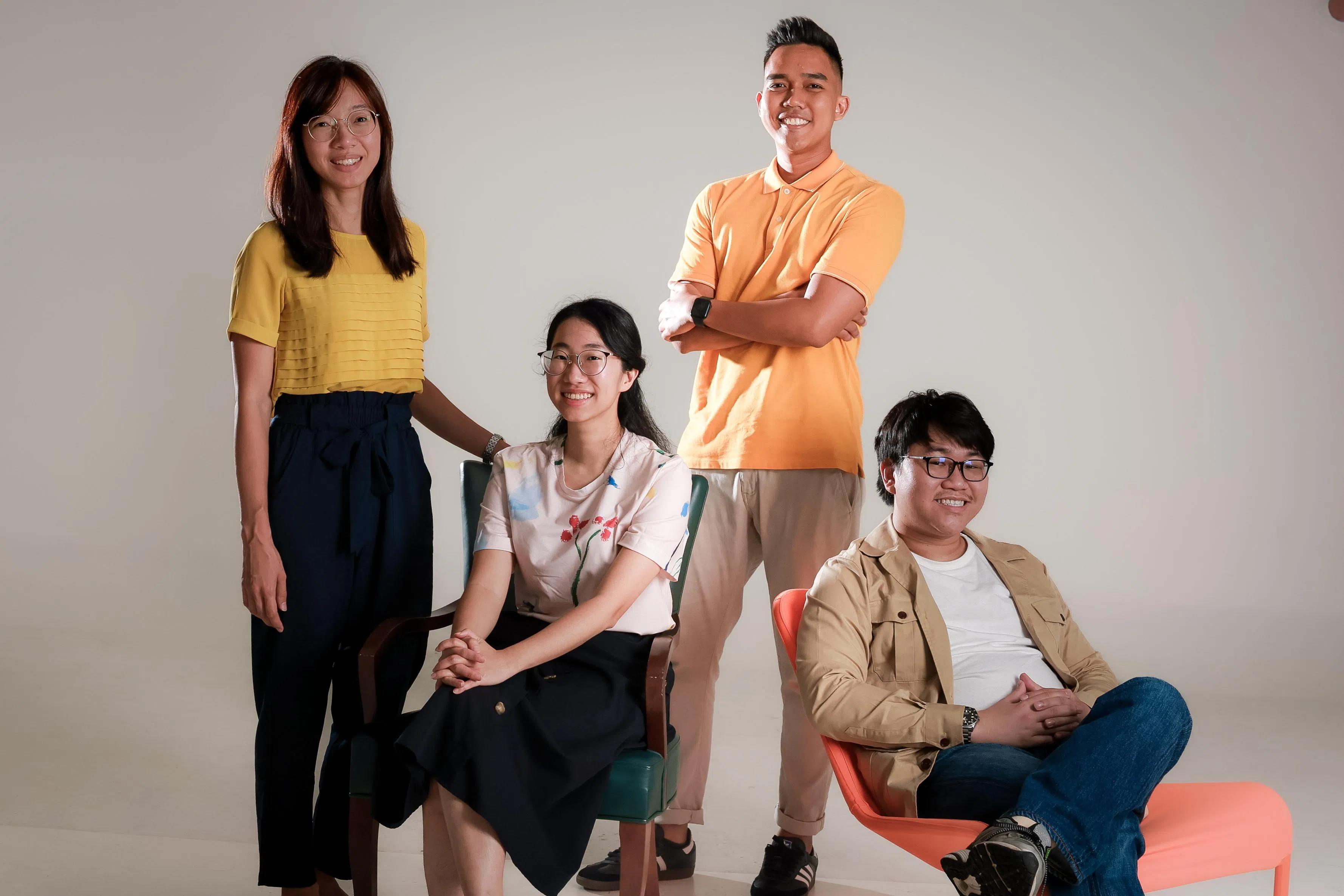 (Seated from left) Headstart On Record hosts - business correspondent Sue-Ann Tan and correspondent Tay Hong Yi - with (standing from left) assistant audience growth editor Joanna Seow and podcast producer Amirul Karim.