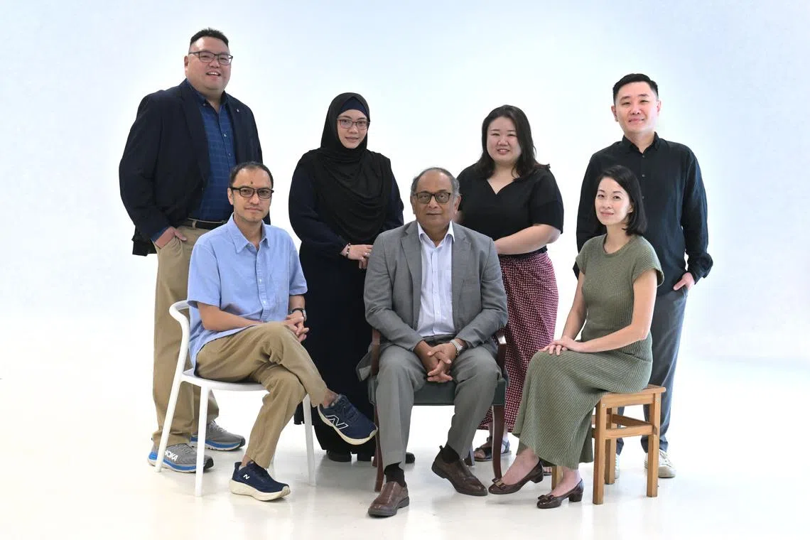 Seated (from left): Assistant podcast editor Lynda Hong, podcast producer Teo Tong Kai, The Usual Place podcast host Natasha Zachariah, podcast producer Eden Soh and podcast editor Ernest Luis. Standing (from left): Podcast producers Amirul Karim, Fa'izah Sani and Hadyu Rahim.