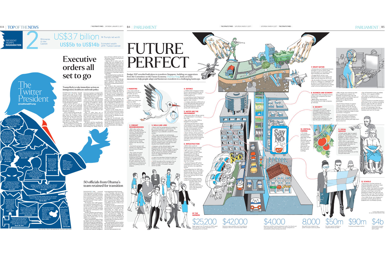 Executive infographics journalist Chng Choon Hiong - who collaborated with digital infographics journalist Billy Ker and senior executive sub-editor Victor Ng to develop the design for "The Twitter President" - said: "We came across a certain picture of President Trump and we immediately knew that we had to capitalise on his distinctive profile. The profile is really what makes the visual arresting."