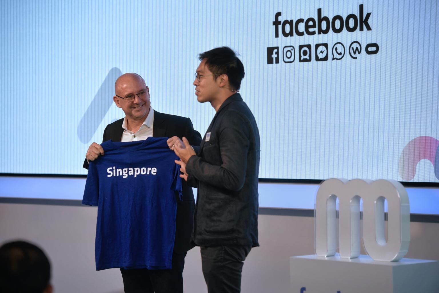 Facebook vice-president Dan Neary (left) receiving a T-shirt from EDB managing director Chng Kai Fong during the opening of Facebook's new office and launch of several new programmes at Marina One, on Oct 2, 2018.