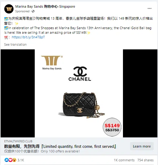 Checks by The Straits Times found one such Facebook page, with 10,000 followers and 10,000 likes, offering a Chanel handbag for $149 to the first hundred shoppers who snagged the deal.