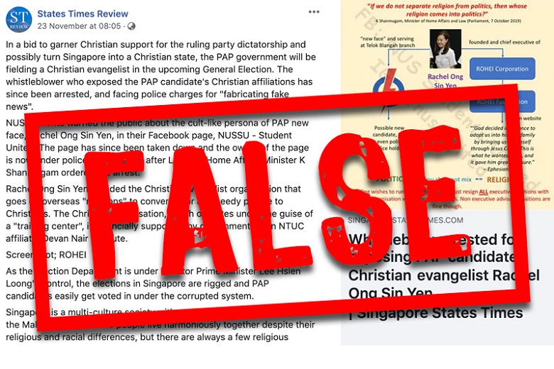 The States Times Review Facebook post had cited a Nussu-NUS Students United post on Ms Ong's alleged religious affiliations and said that one person involved in the matter was arrested and another was being investigated by the police.