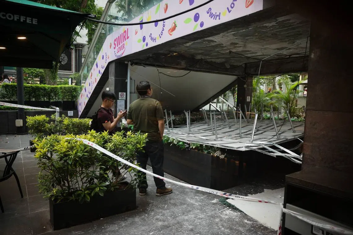 Photos circulating on Facebook on Sept 12 show the collapsed structure in an area outside acai shop Swirl Lover. Pieces of cement debris can be seen strewn across the floor, some distance away.